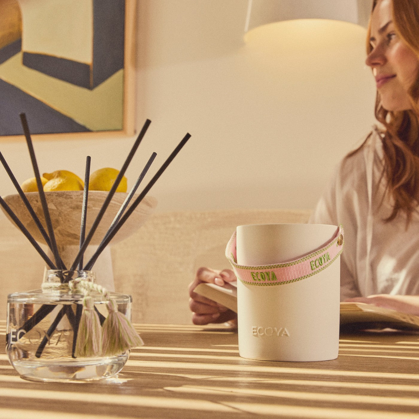 This year’s hero Ceramic Candle is relaxed yet refined, crafted in a crisp white vessel and finished with a bespoke woven handle.